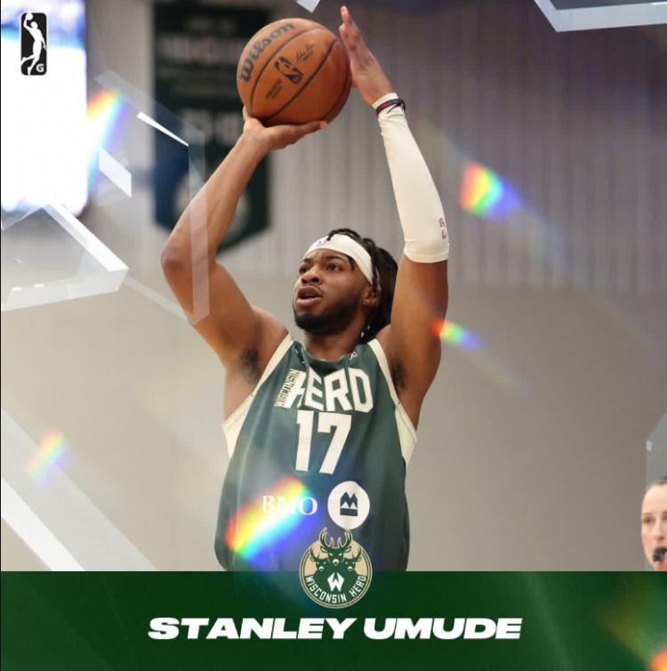乌姆德今年26岁,身高1米98,上赛季是雄鹿的双向球员,出战22场比赛,场均3.9分钟,得到0.7分0.8篮板。