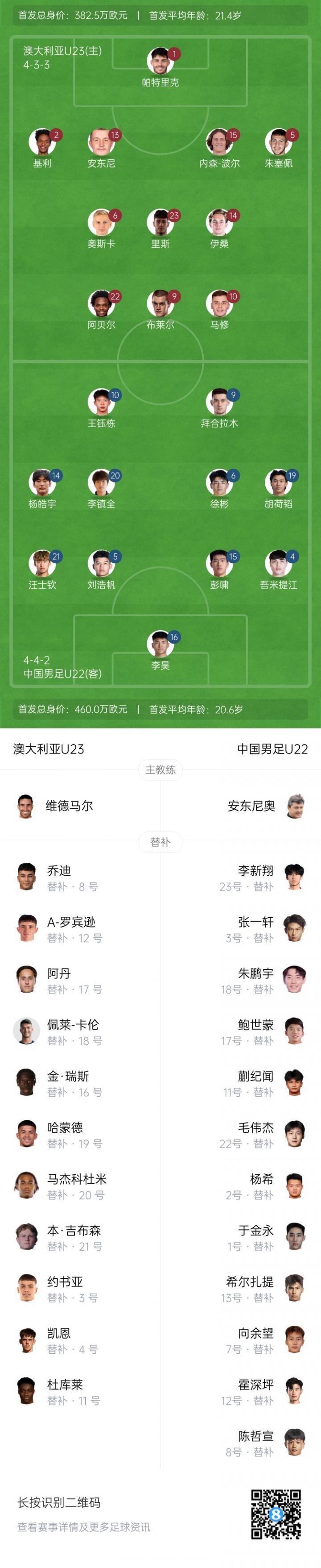 王钰栋150万!U22国足vs澳大利亚首发身价:460万欧vs382万欧